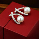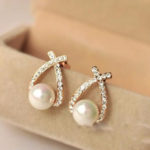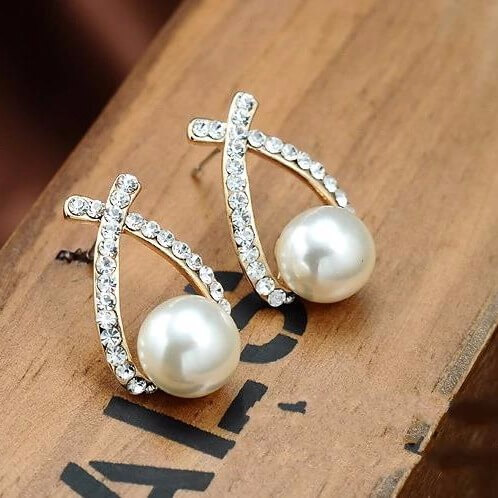 - Elegantni uhani s prekrižanima nizoma bleščečih kamenčkov in velikim umetnim biserom.