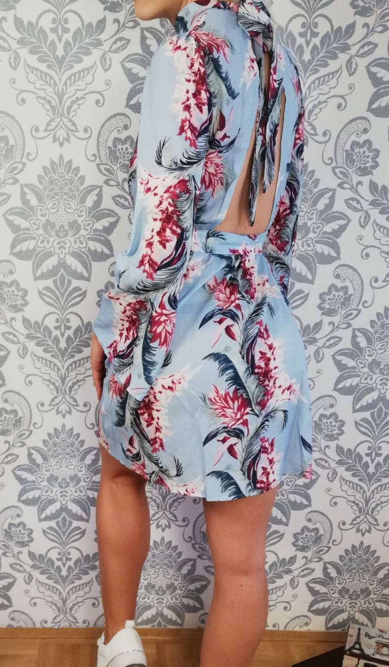 Modra poletna obleka s paskom in odprtim hrbtom